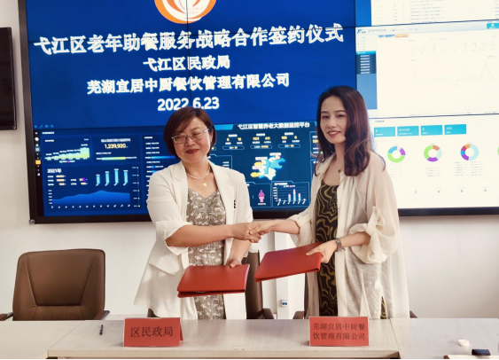 6月23日下午,蕪湖宜居中廚餐飲管理有限公司與弋江區(qū)民政局正式簽署了老年助餐服務(wù)戰(zhàn)略合作協(xié)議,市民政局副局長王峰、弋江區(qū)民政局局長孫亞敏、弋江區(qū)民政局副局長曹存明、宜居博覽公司總經(jīng)理王次武、宜居中廚公司總經(jīng)理邢維丹出席了簽約儀式。