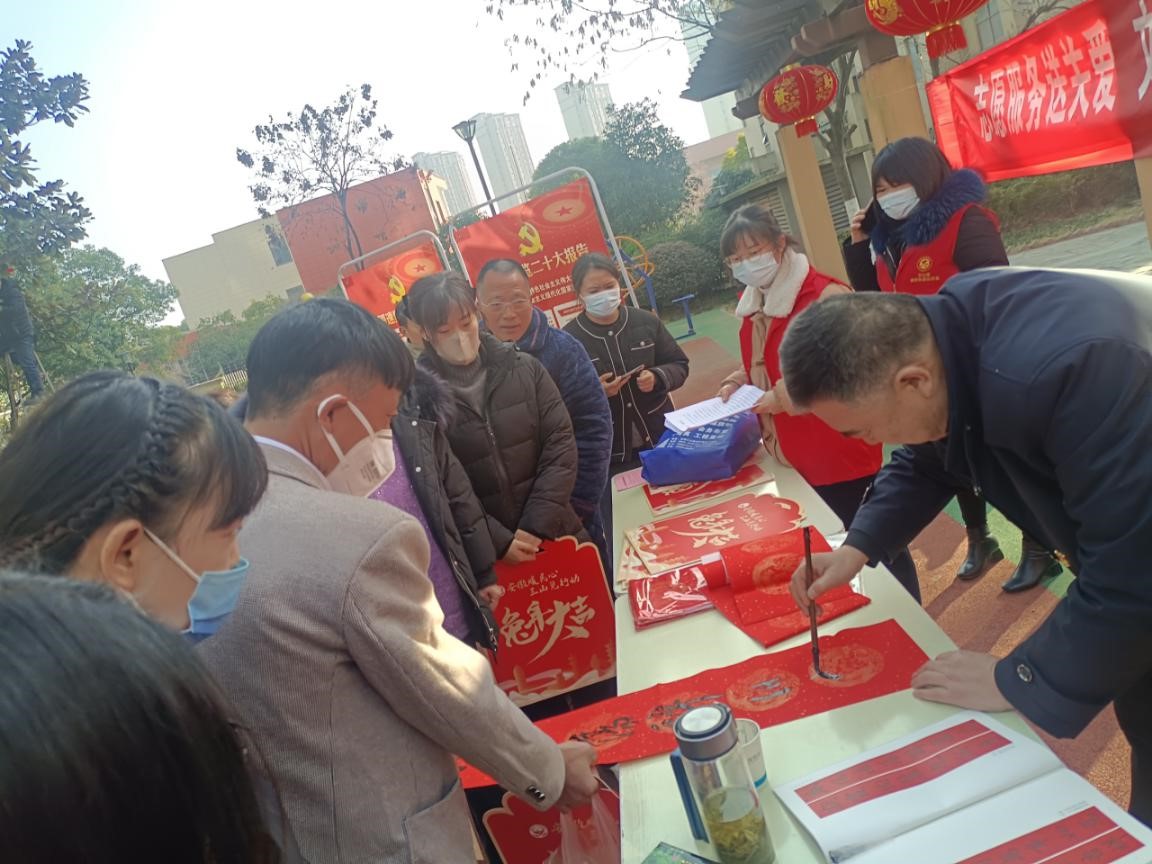 在公租房小區(qū)開展寫春聯(lián)、送祝福活動,活動現(xiàn)場,書法家們飽蘸濃墨,在大紅的紙上飛筆書福,既喜慶又紅火,活動現(xiàn)場洋溢著一派節(jié)日的喜慶氣氛。